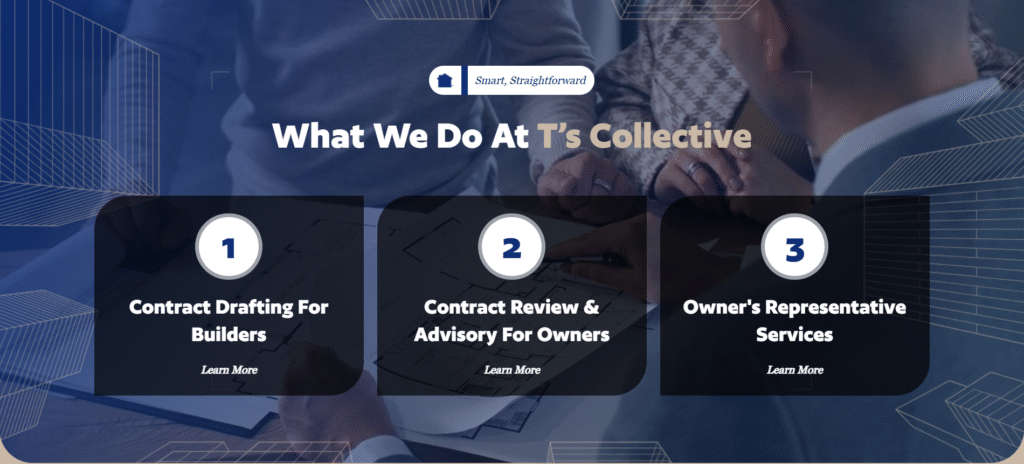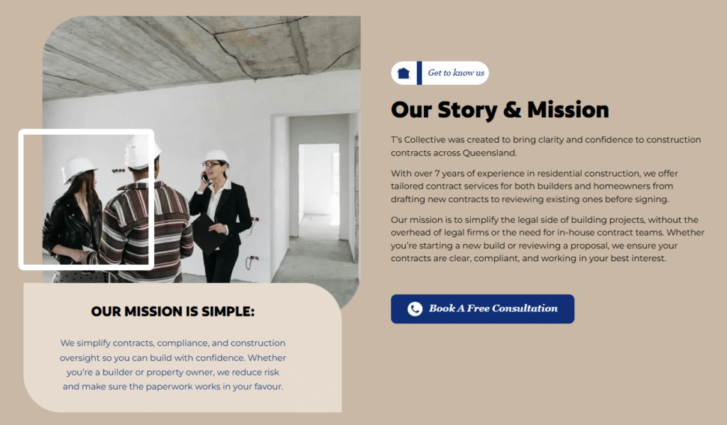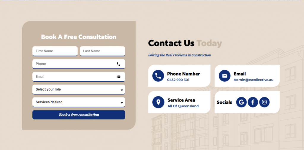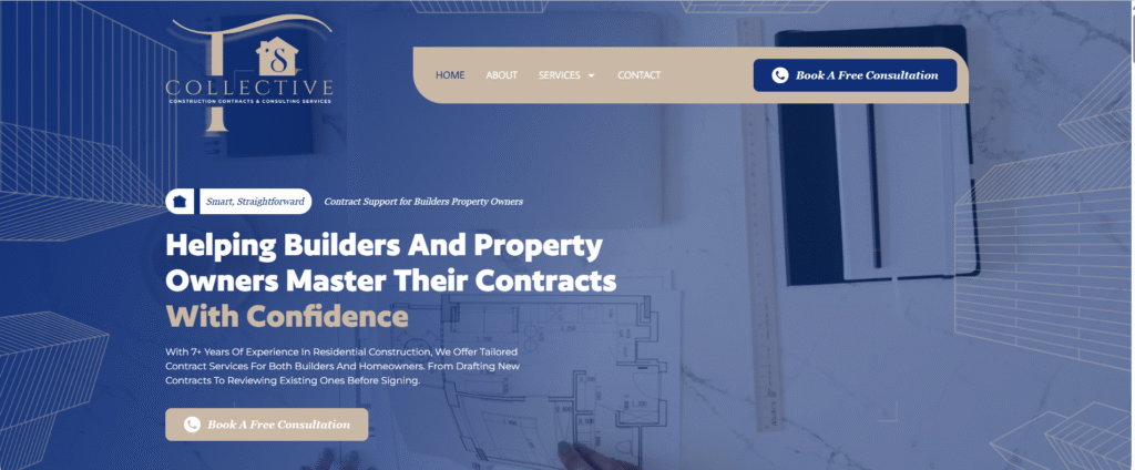 TS Collective provides expert construction contract services for builders and property owners across Queensland. With over 7 years of industry experience, they offer everything from contract drafting to owner representation. However, their outdated website wasn’t reflecting the professionalism and expertise they bring to every project. The old design was holding them back from attracting the high-quality clients they deserved.